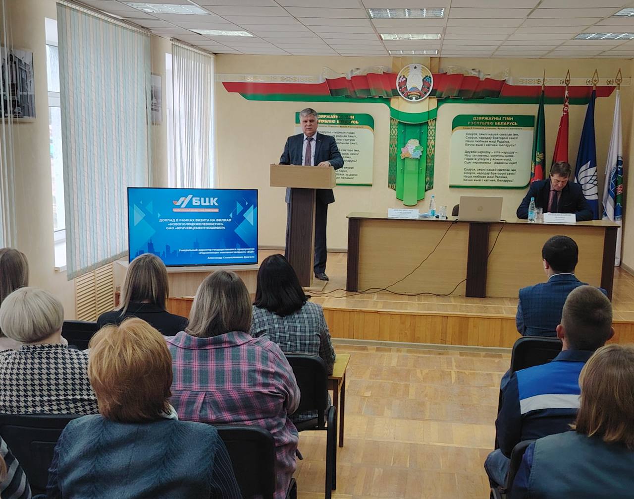 На встрече с трудовым коллективом филиала рассмотрены ключевые показатели деятельности холдинга «Белорусская цементная компания», ОАО «Кричевцементношифер» и филиала «Новополоцкжелезобетон» за девять месяцев 2025 года, планы и задачи по развитию. Презентованы инновационные решения и передовые экологические технологии холдинга.